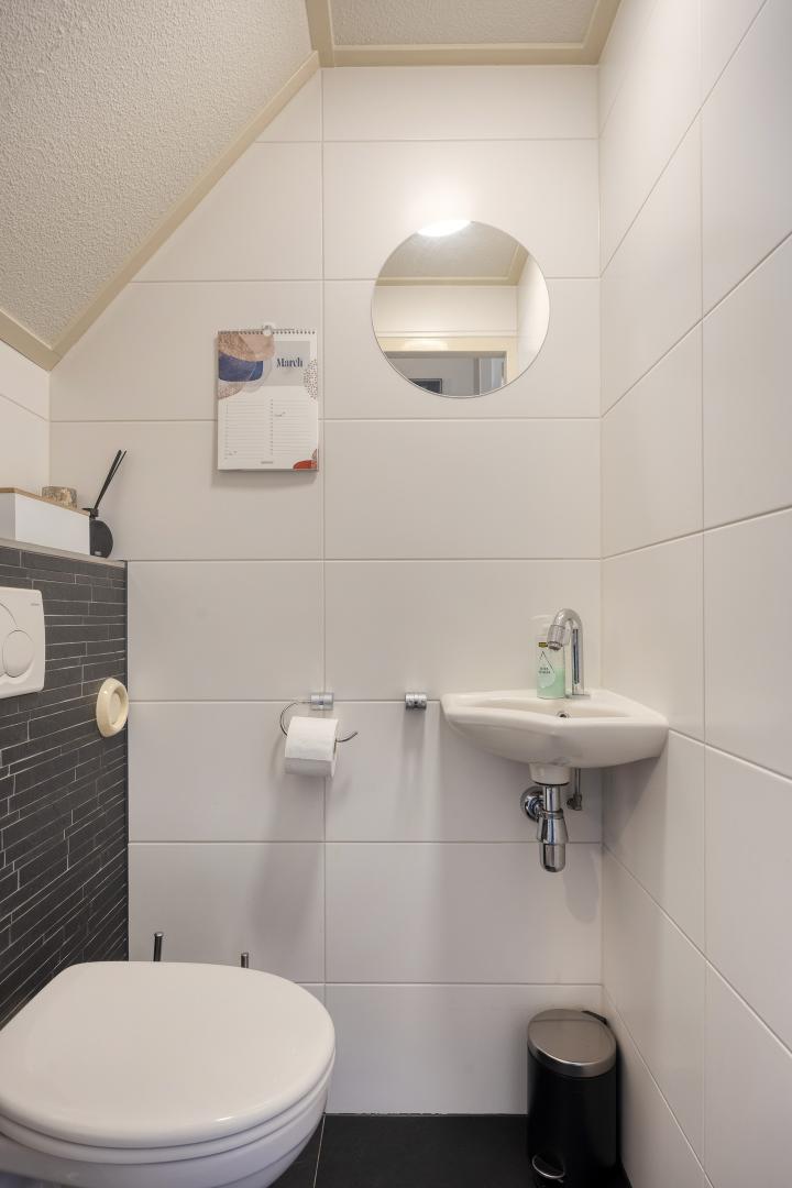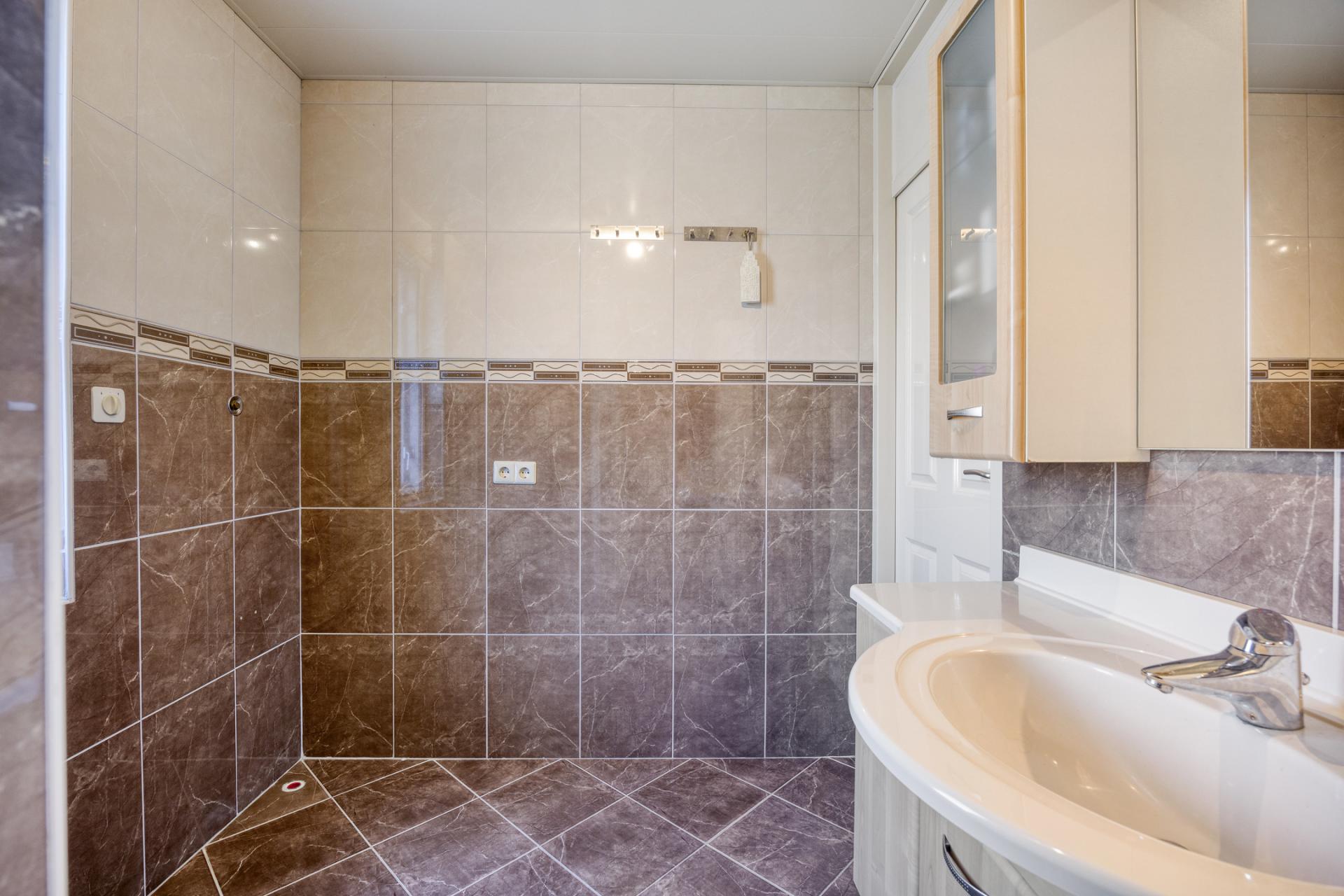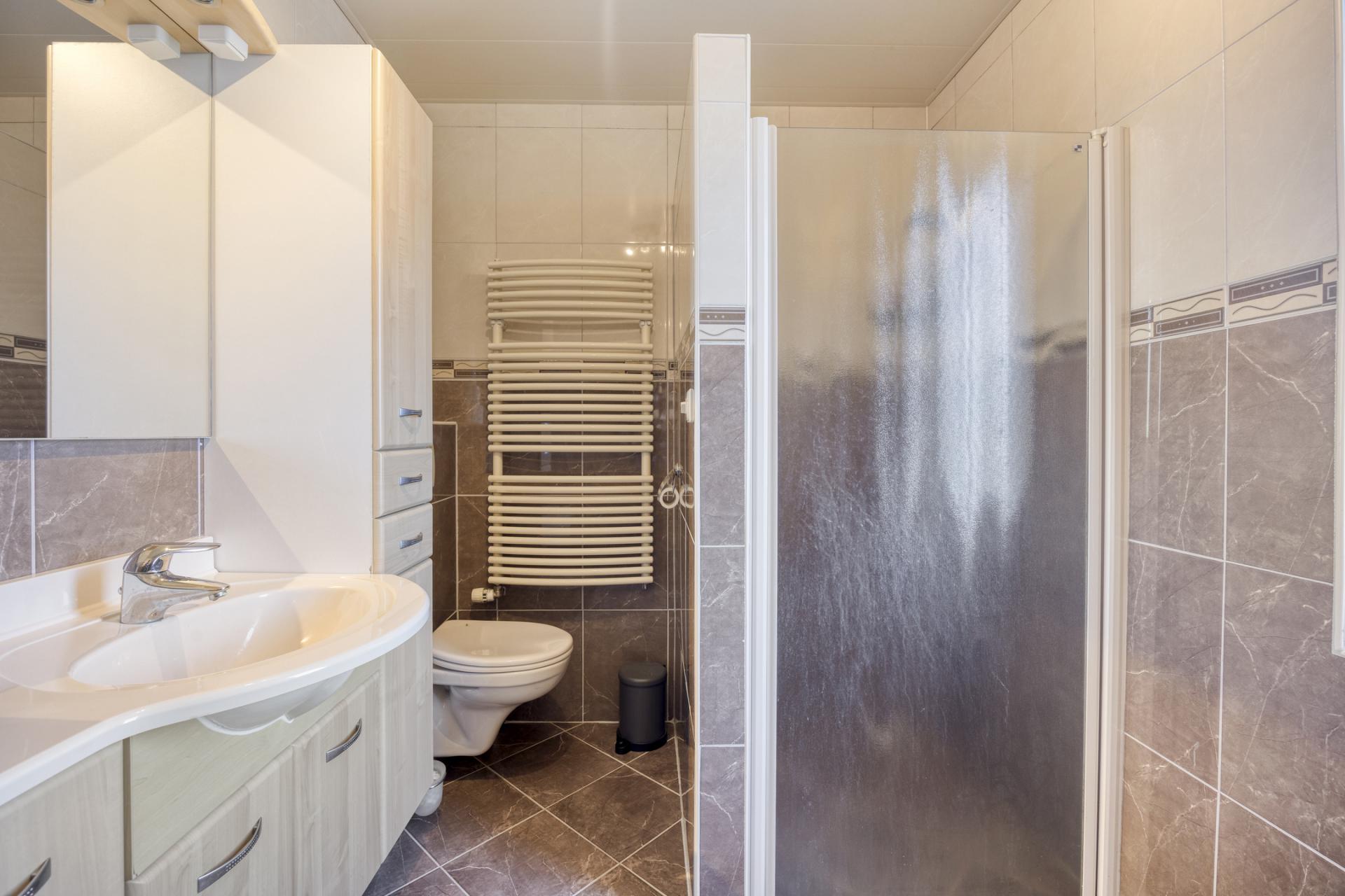 De badkamer is in 2007 vernieuwd en voorzien van fraaie grote wand- en vloertegels in warme tinten. Er is een inloopdouche, een wasmeubel met veel bergruimte, een tweede toilet en een designradiator aanwezig.