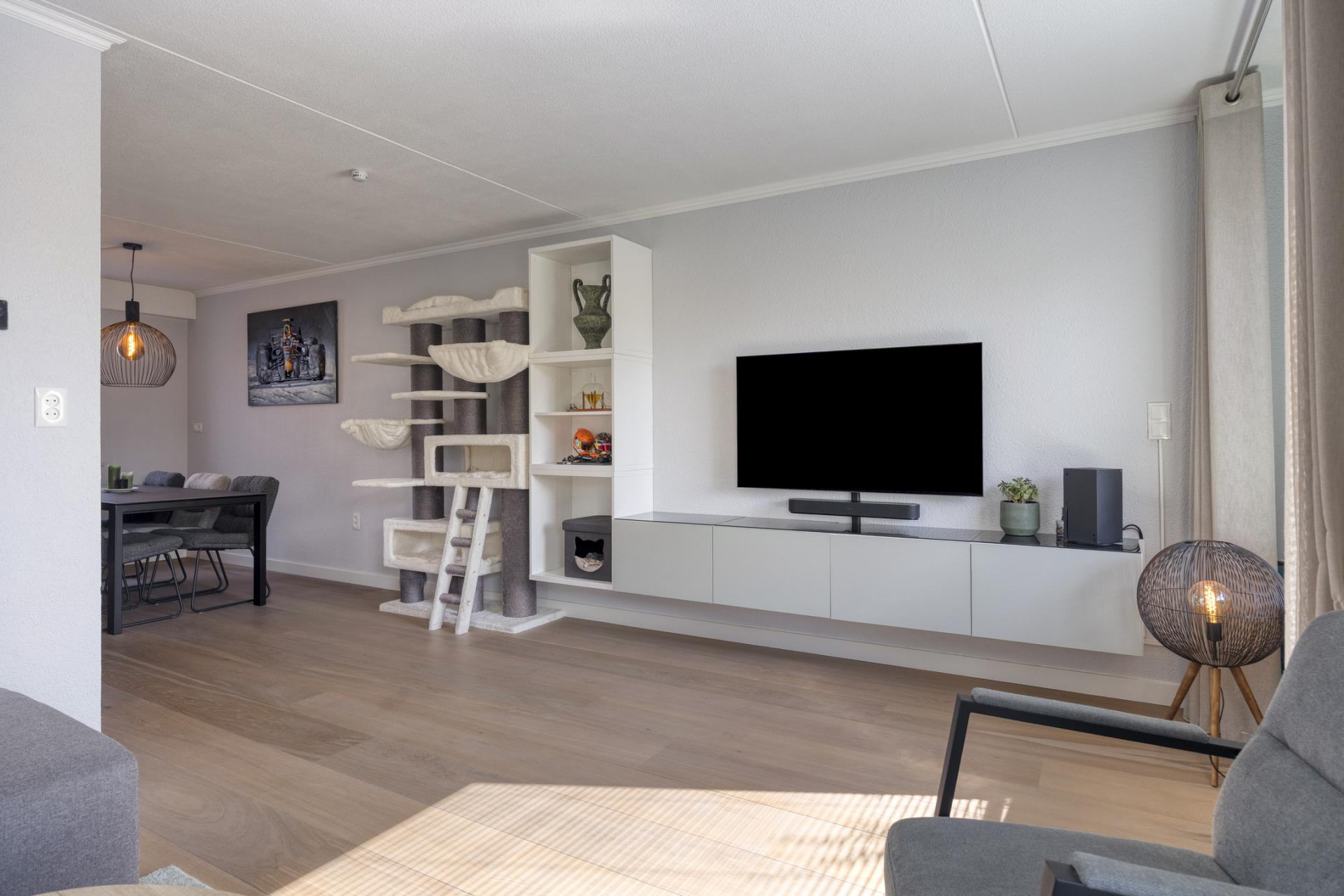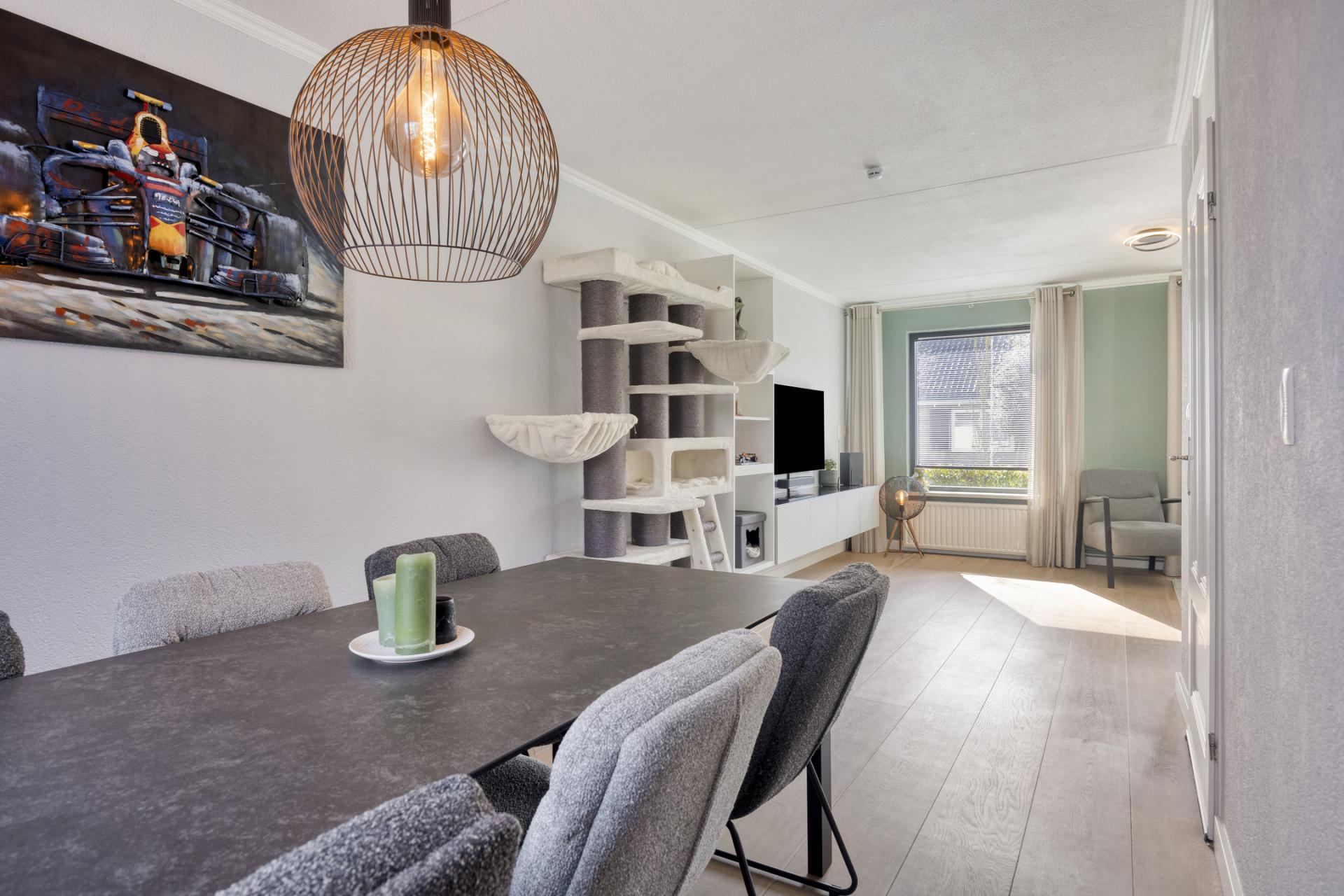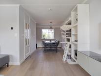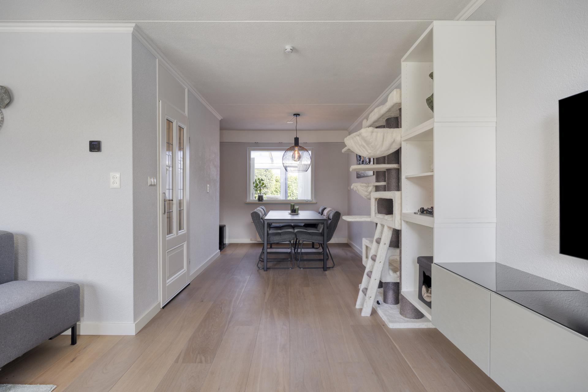 Aansluitende de L-vormige woonkamer die is onderverdeeld in een zithoek en een eetgedeelte. De prachtige houten vloer (lamelparket) is gelegd in brede lamellen en heeft daardoor een robuust rustieke uitstraling, recent is de vloer opnieuw opgeschuurd en in de olie gezet.