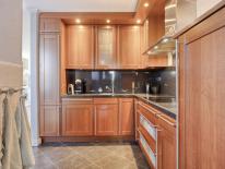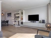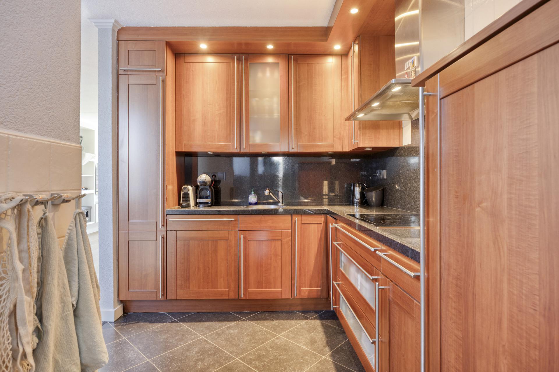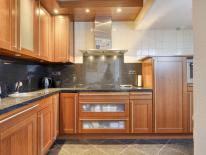 De keuken is eveneens opgesteld in L-vorm en voorzien van diverse inbouwapparatuur waaronder een inductie kookplaat, koelkast, vaatwasmachine en een combi oven-magnetron. Het prachtige donkere werkblad is doorgetrokken in de achterplaat en daardoor heeft het geheel een chique uitstraling. Omdat het werkblad nog zo mooi is kunt u deze keuken -indien gewenst- eenvoudig een nieuw look geven door bijvoorbeeld alleen de frontjes te vervangen. Wij vertellen u tijdens een bezichtiging alles over deze mogelijkheid.