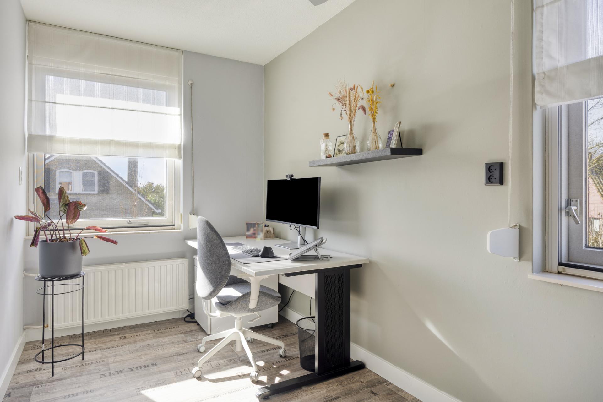 In 2012 is er een dakkapel geplaatst (kunststof) waardoor deze slaapkamer veel bruikbare ruimte én royale daglichttoetreding heeft. De knieschotten in deze kamer zijn keurig afgewerkt en bieden veel bergruimte.