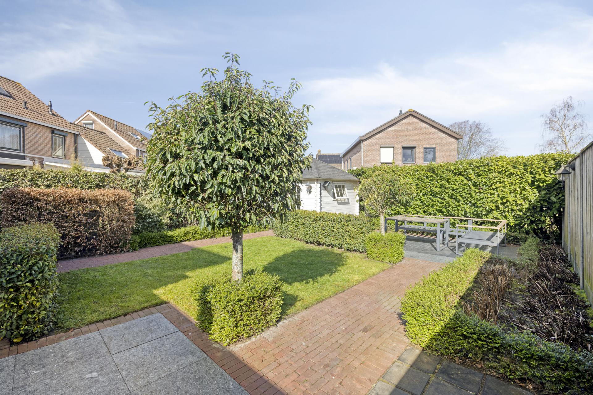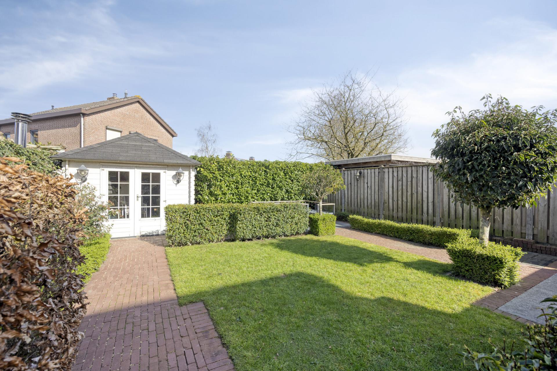 Verder bestaat de tuin uit verharding (sierbestrating) en gazon en er staat een volwassen haag rond het perceel. Wat een fijne tuin om hier te zitten!