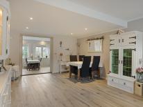 De woonkamer en keuken bevinden zich rechts van de hal en deze zijn middels fraaie suitedeuren van elkaar te scheiden. De woonkamer is recent geheel gerenoveerd en heeft met 31 m2 een mooie oppervlaktemaat. Middels de suitedeuren is dan de grote woonkeuken te bereiken. Het keukenblok is opgesteld in L-vorm en voorzien van diverse inbouwapparatuur waaronder een vaatwasmachine, een oven, een koelkast (1 jr. oud) en er wordt gekookt op inductie.