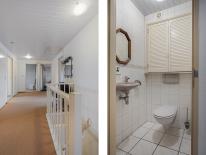 We komen binnen in de lange hal welke toegang biedt tot bijna alle vertrekken welke zich gelijkvloers bevinden, maar ook de meterkast, de trapopgang naar de eerste verdieping en het separaat toilet met fonteintje bevinden zich in de hal.