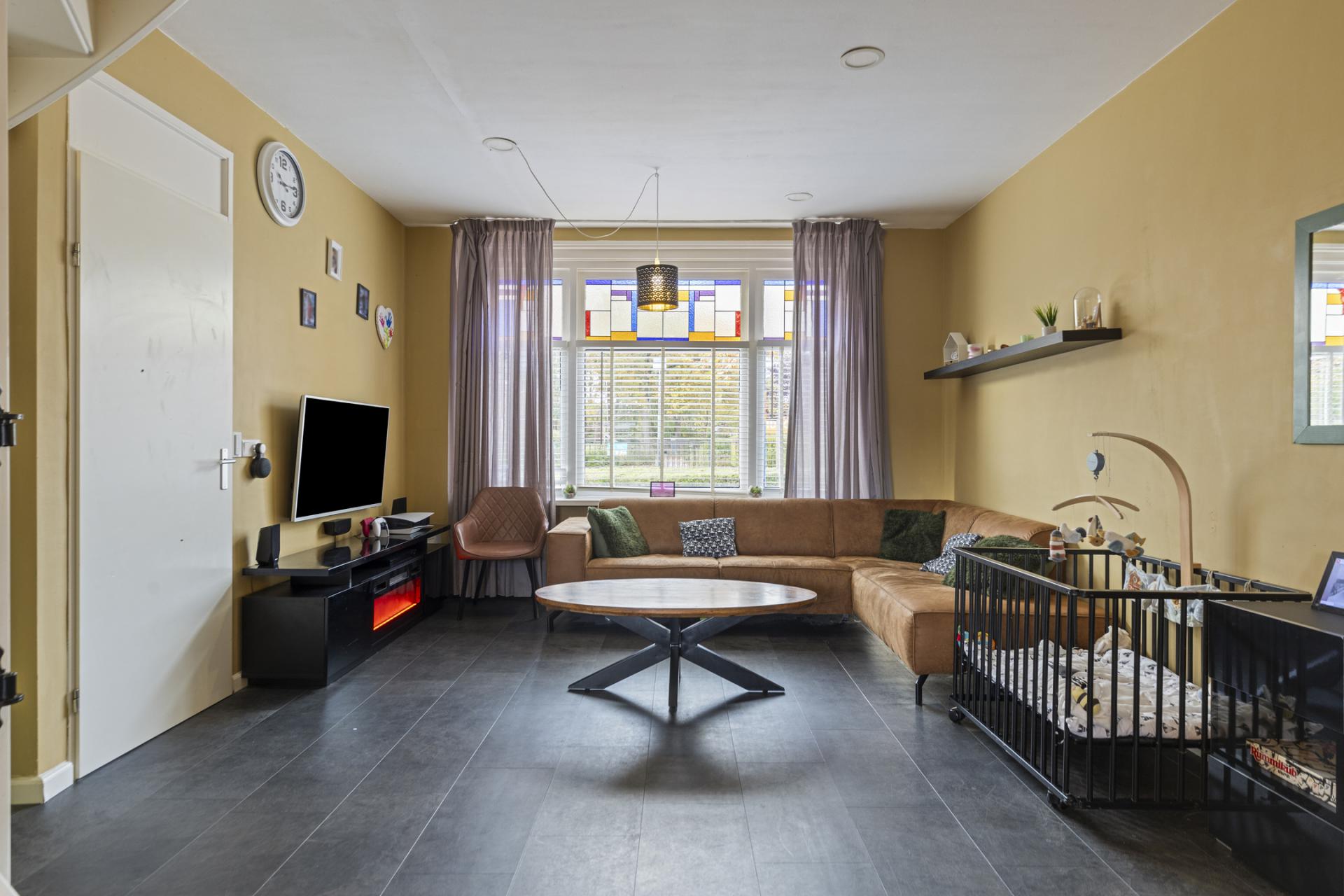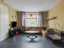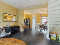 Entree in de ruime hal met toegang tot de woonkamer en meterkast. Bij binnenkomst in de royale woonkamer valt direct de zacht gekleurde lichtinval op. Door de originele glas in lood ramen aan de voorzijde valt rond het middaguur dit prachtige licht binnen.