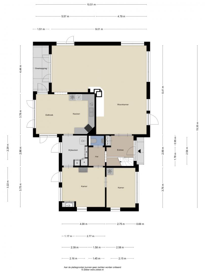 Eveneens op de begane grond twee extra kamers met afmetingen van respectievelijk 10.40m2 en 15.35m2 welke dienst kunnen doen als kantoor/slaapkamer/studeerkamer en/of praktijkruimte.