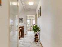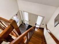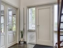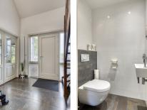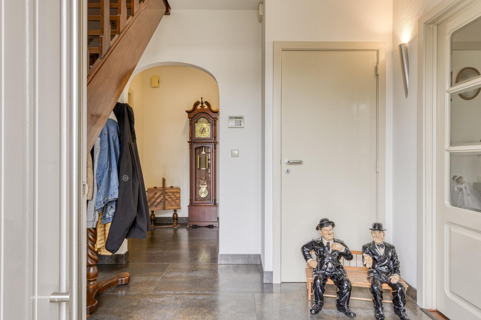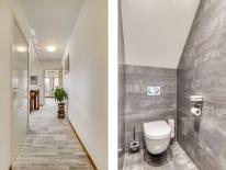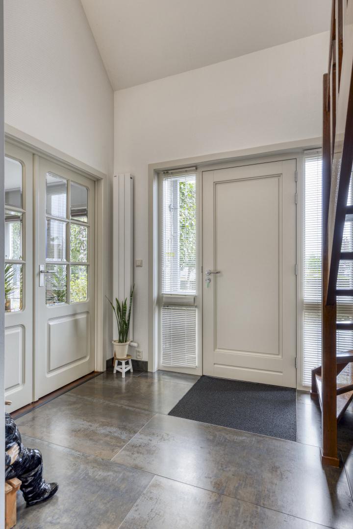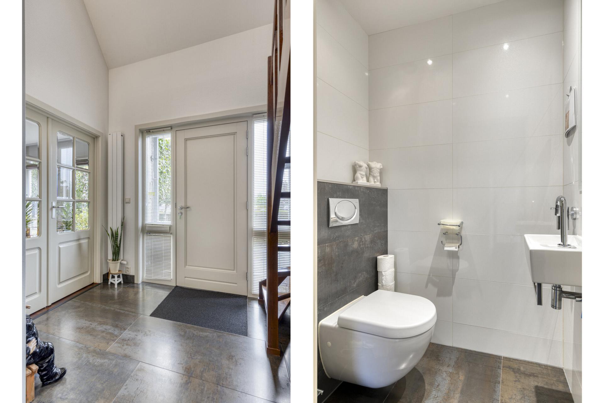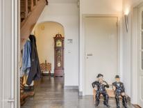 Entree in de royale hal met meterkast, separaat toilet met fonteintje en de trapopgang naar de eerste etage.