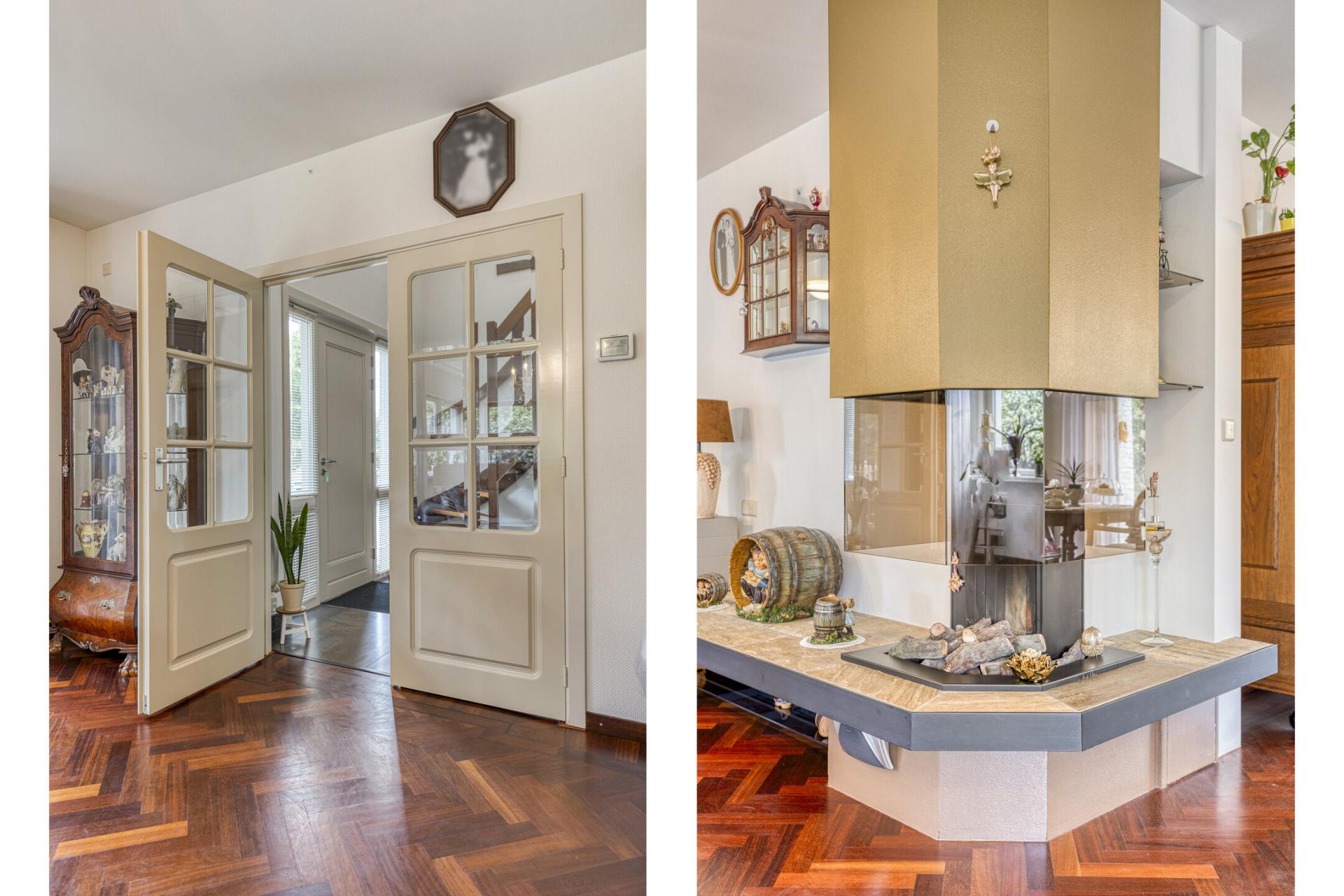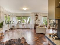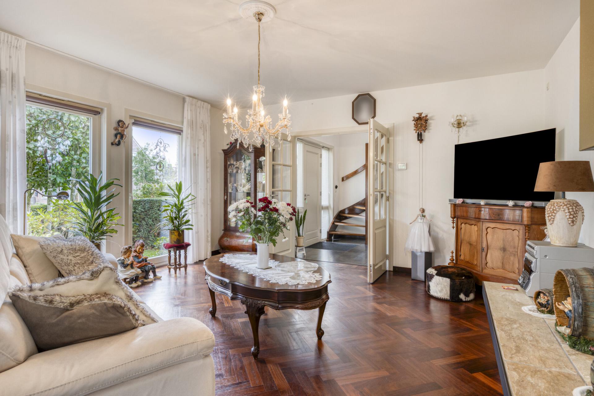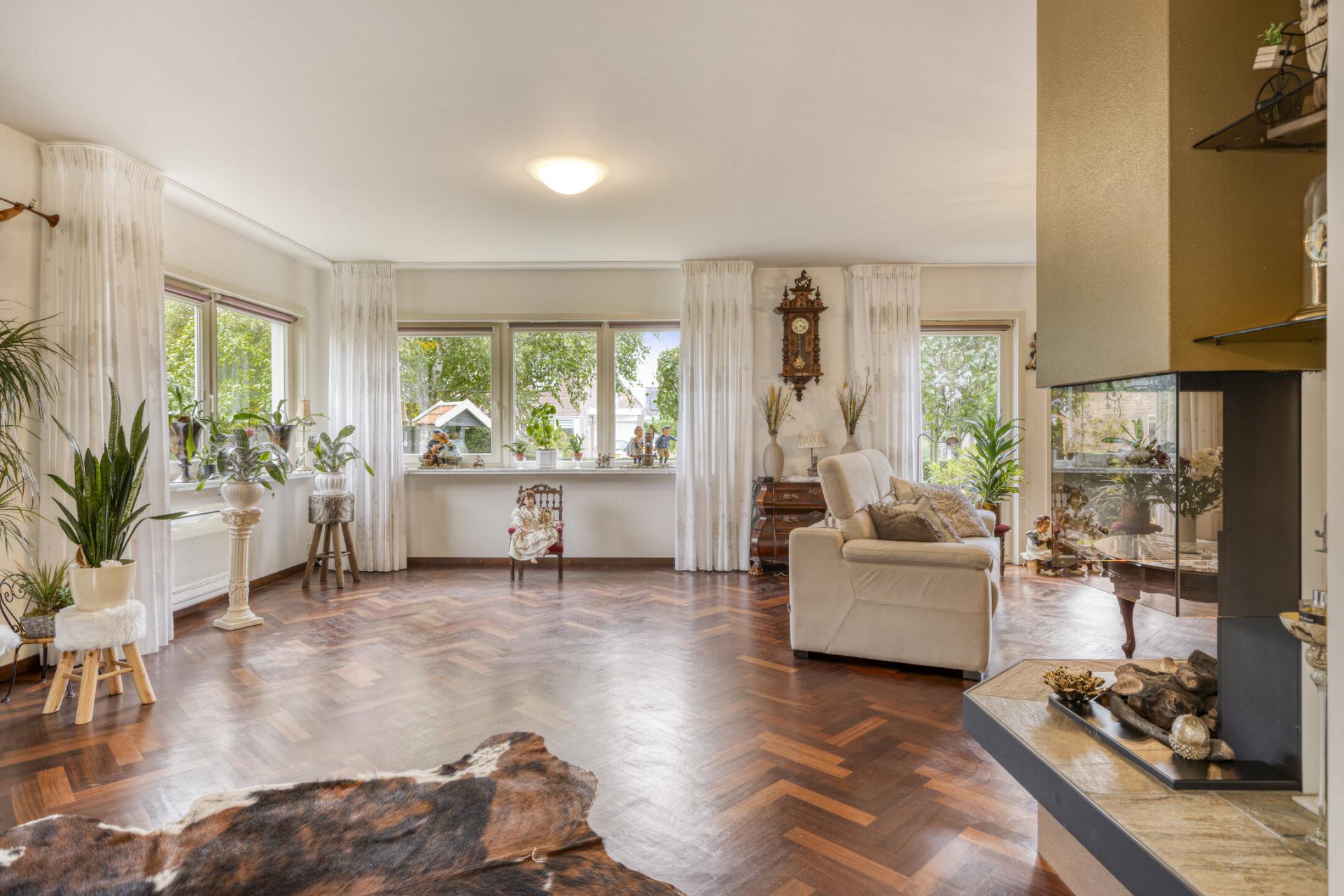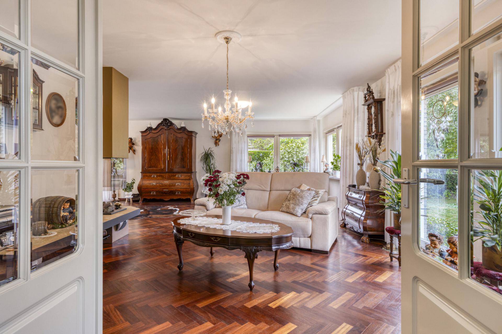 Door de dubbele openslaande deuren betreden we de grote -maar zeer gezellige- living welke is voorzien van een houten vloer gelegd in visgraatmotief en strak afgewerkt met bies. De L-vormige living is voorzien van een gashaard voor gezellige uren tijdens koude dagen.