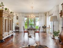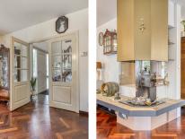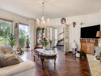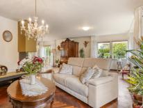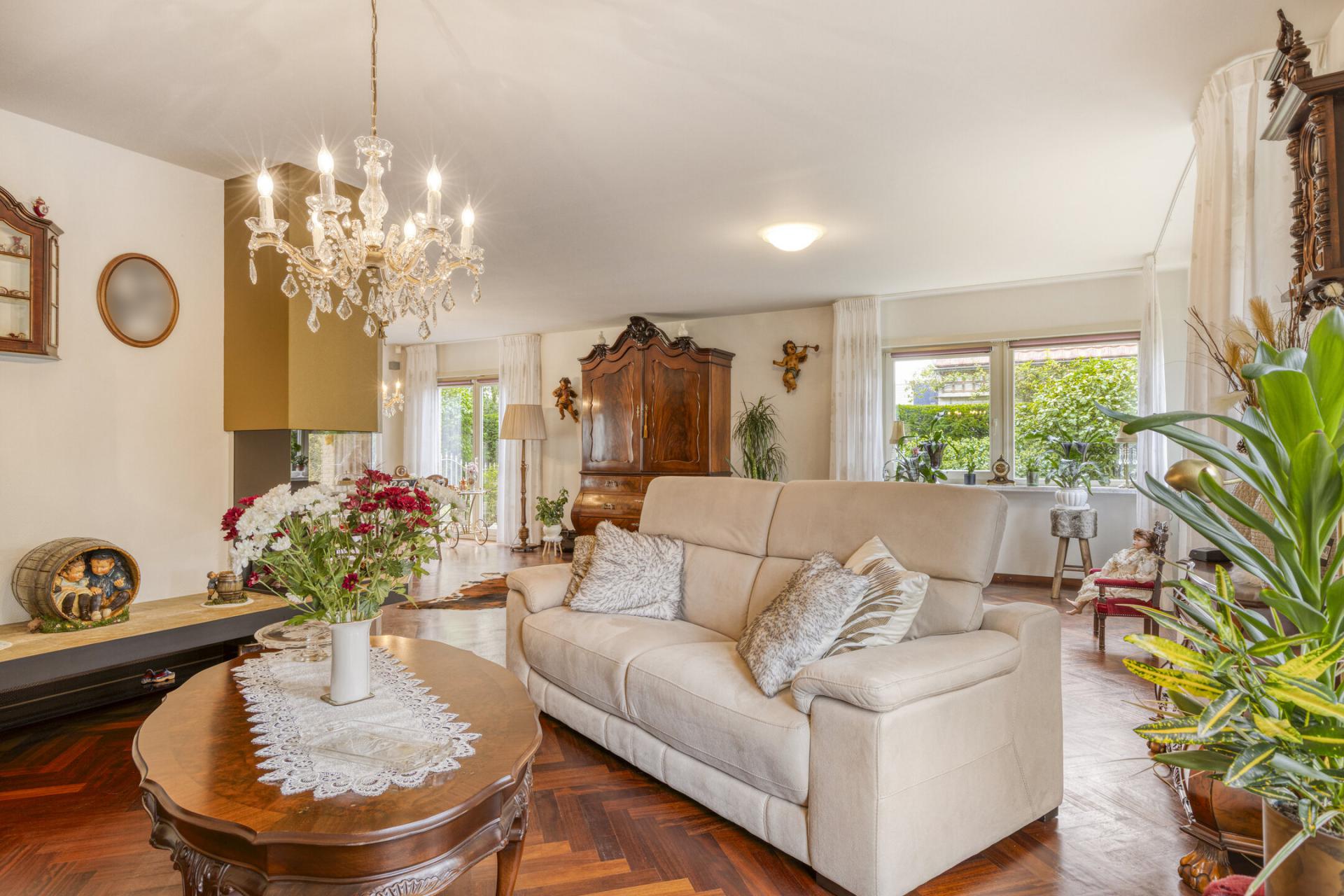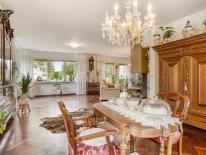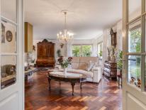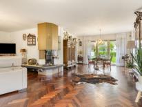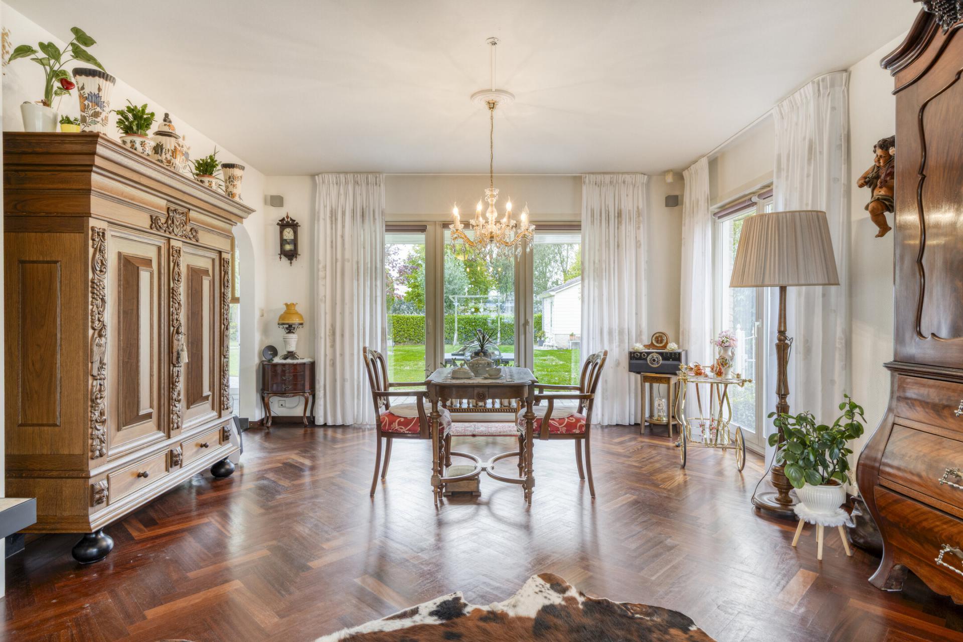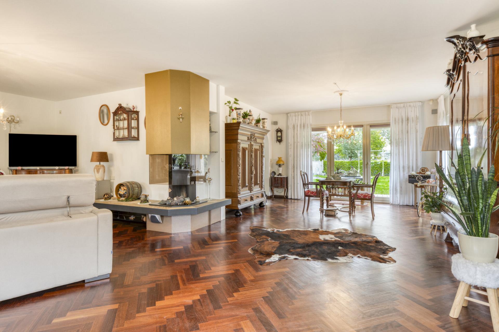 Door de dubbele openslaande deuren betreden we de grote -maar zeer gezellige- living welke is voorzien van een houten vloer gelegd in visgraatmotief en strak afgewerkt met bies. De L-vormige living is voorzien van een gashaard voor gezellige uren tijdens koude dagen.