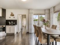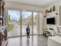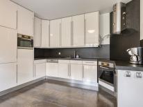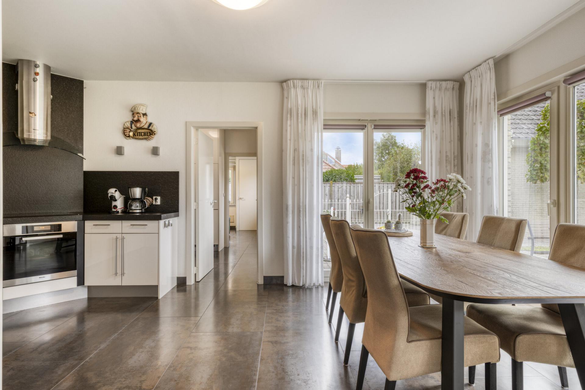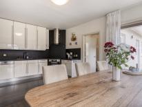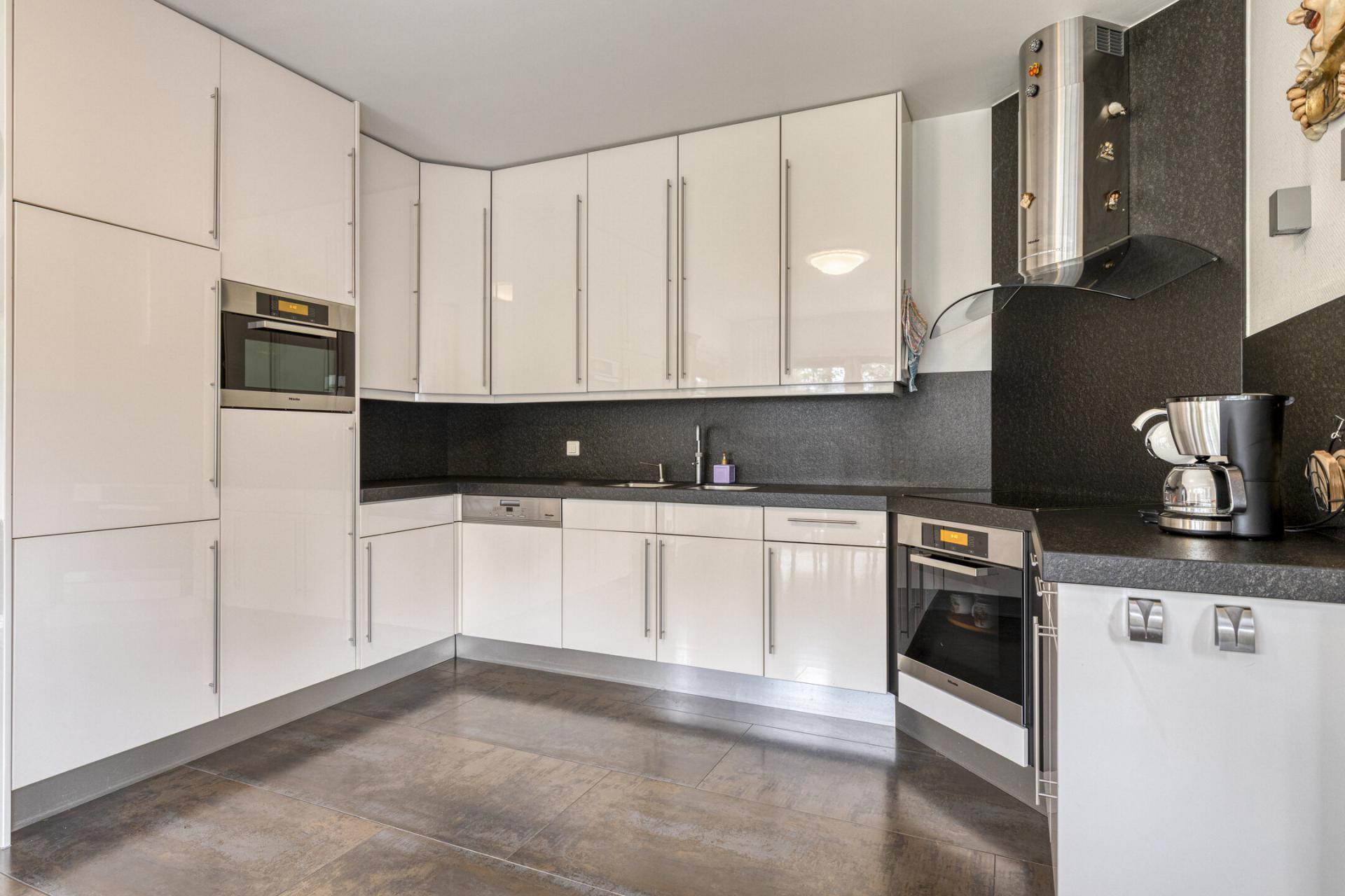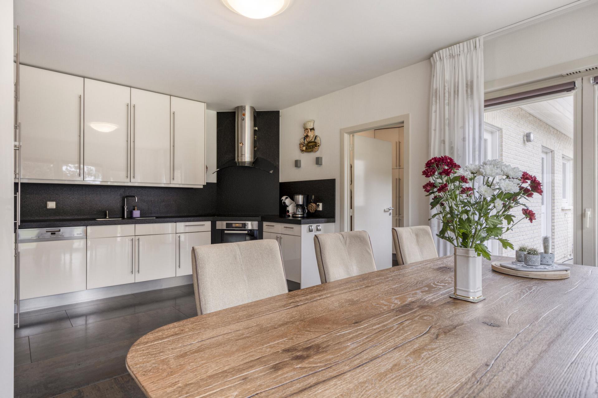 Aansluitend de gesloten woonkeuken met het keukenblok (2010) in U-vorm. Het geheel is uitgevoerd in hoogglans wit met een donker hardstenen werkblad met dito achterplaat voor een strakke afwerking. De keuken is voorzien van diverse inbouwapparatuur waaronder een combi oven/magnetron, Quooker voor direct kokend water, inductie kookplaat, een vaatwasmachine, een dubbele spoelbak en twee ingebouwde koelkasten*. Ook in de keuken is veel daglicht door de grote raampartijen met een prachtig uitzicht op de heerlijke tuin.