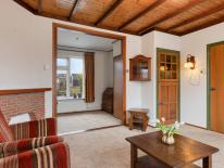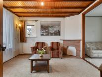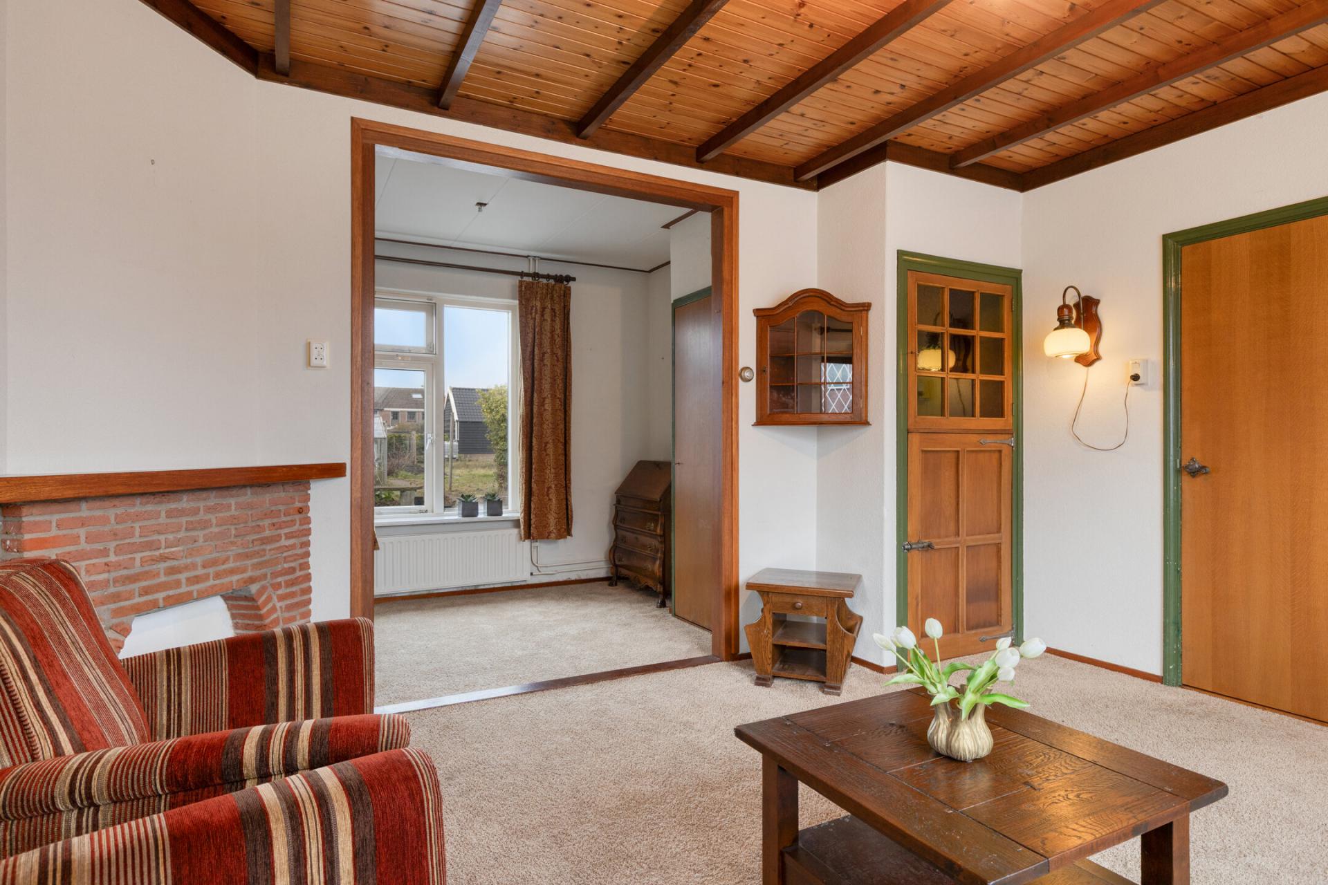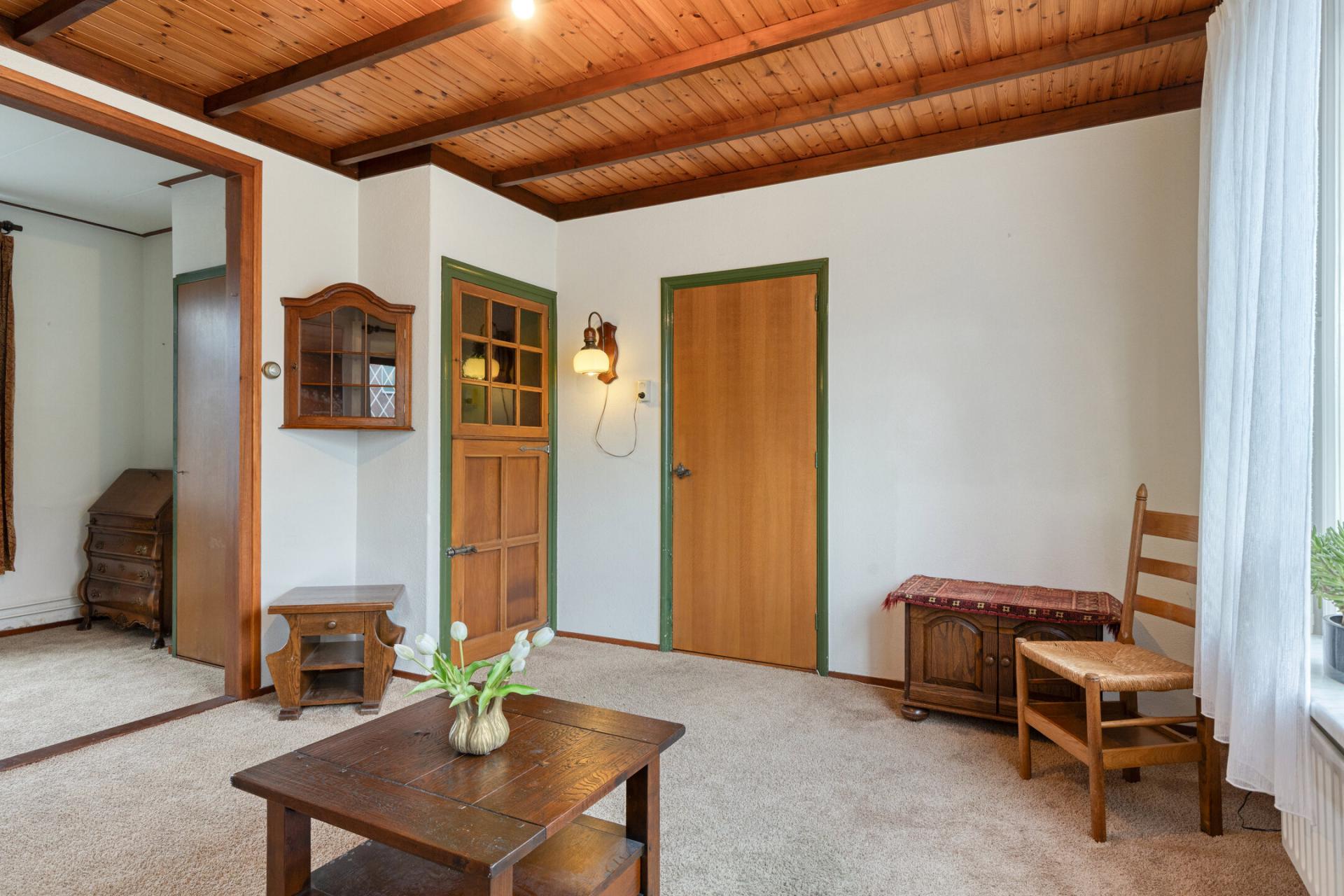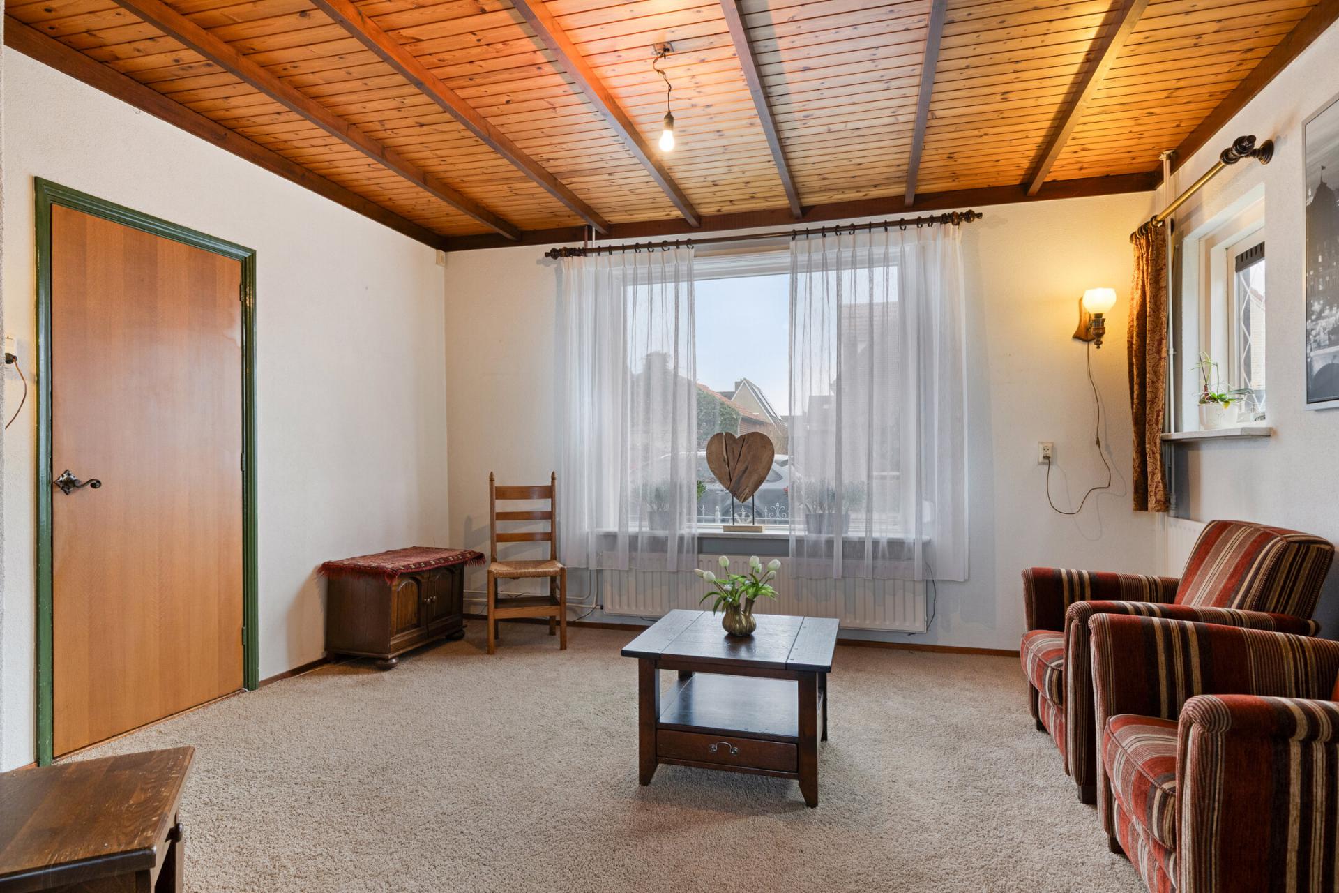 Aansluitend de gezellige woonkamer die nog de originele indeling heeft nl een voor- en achterkamer. Door de grote raampartijen is er royaal daglichttoetreding en er zijn twee vasten kasten. Deze woning is gebouwd in 1950 en nagenoeg zo gebleven met nog vele originele details zoals de prachtige zoldering.