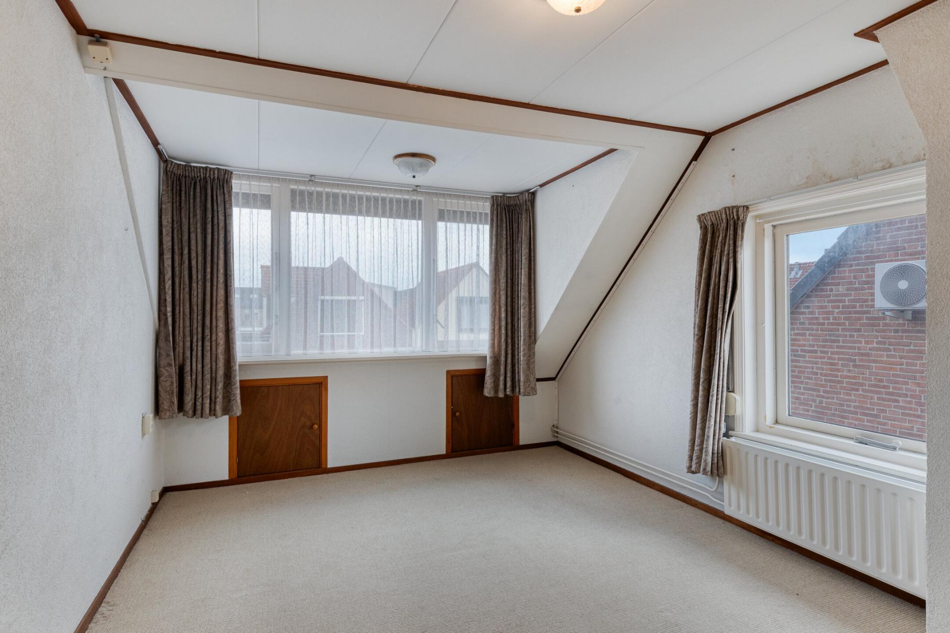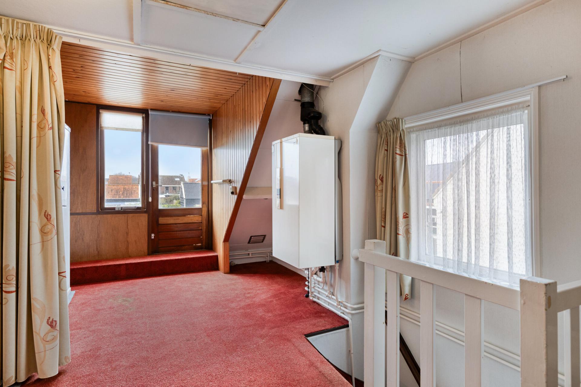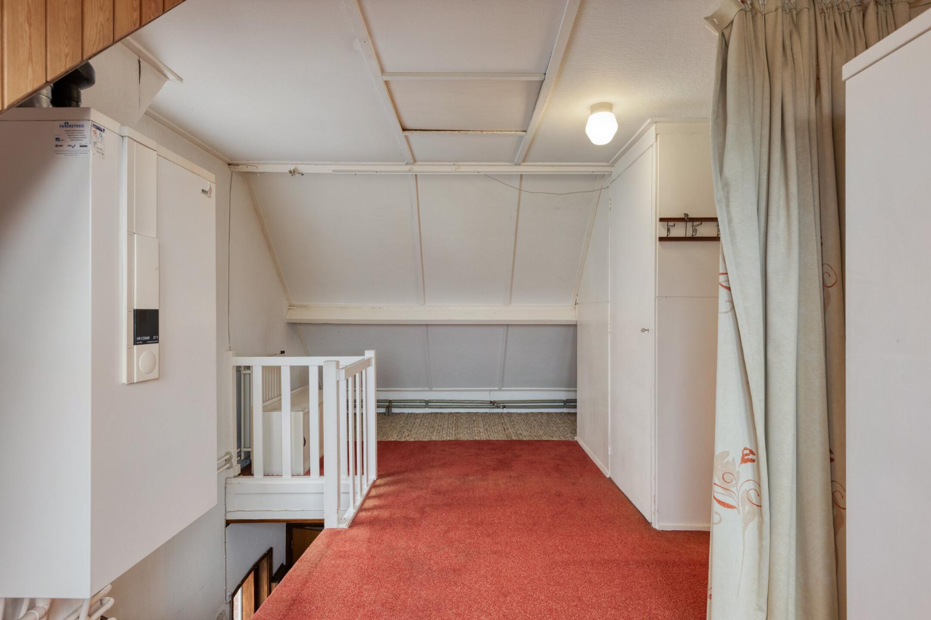 Deze bovenverdieping is heel makkelijk op te splitsen in vier slaapkamers. De aanwezige slaapkamer is voorzien van een wasmeubel en afgetimmerde knieschotten. Op de voorzolder is een CV installatie aanwezig, echter, deze is niet (meer) in werking.