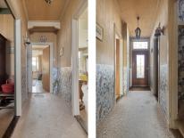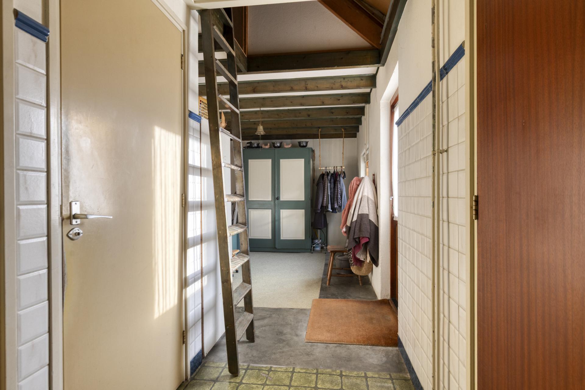 Middels de houten voordeur met het mooie siersmeedwerk is er entree in de hal met eenvoudige meterkast, toegang tot de woonkeuken, woonkamer, kantoor en de trapopgang naar de eerste verdieping.