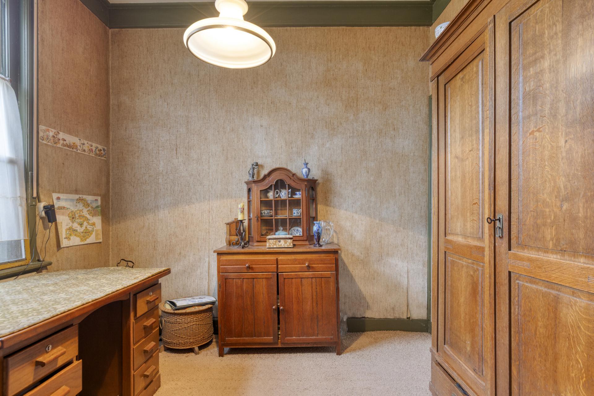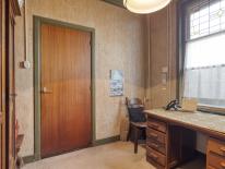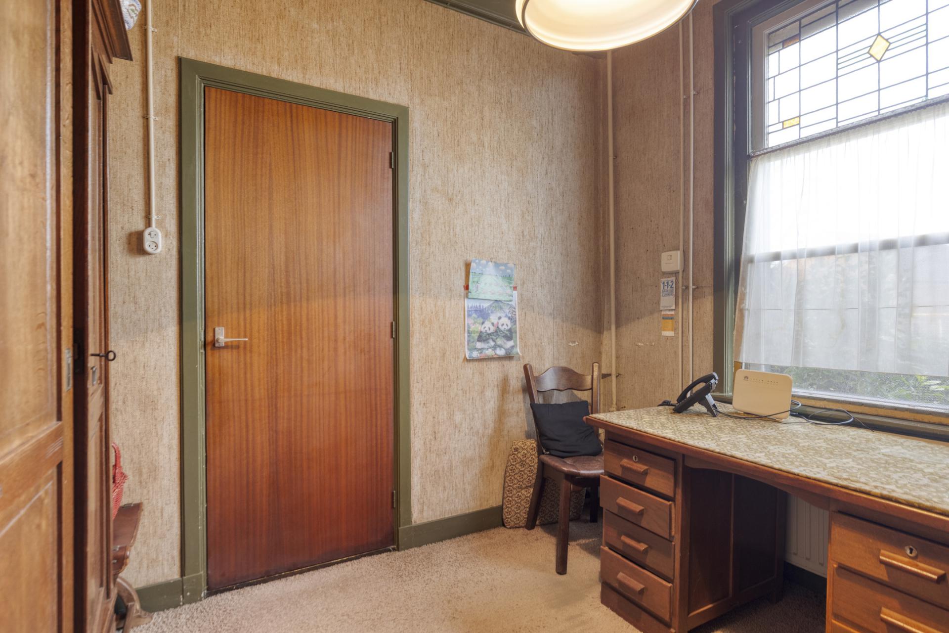Het kantoor heeft een vaste kast en bevindt zich aan de voorzijde van het pand.