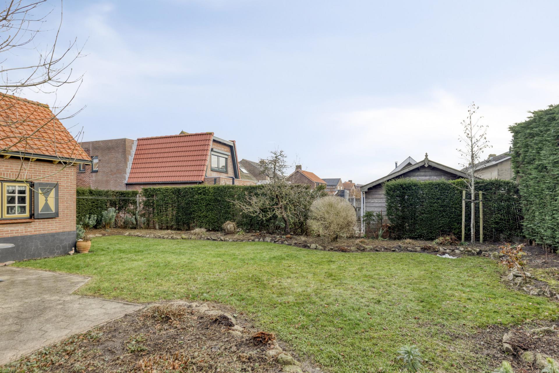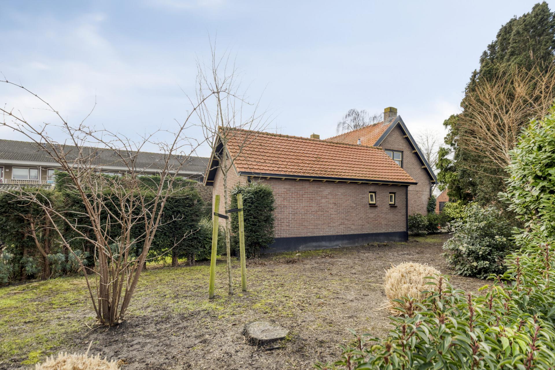 Het grote perceel grond bevindt zich grotendeels aan de zuidwestzijde van het pand en het biedt veel mooie mogelijkheden tot het realiseren van een schuur of garage met aan beide zijden een opgang. Keuze dus waar u deze schuur of garage wilt realiseren, bovendien is er altijd een plek uit te kiezen waar het goed toeven is in de schaduw. De tuin bestaat deels uit verharding en deels uit gazon en volwassen beplanting met veel verschillende soorten bloemen en planten.