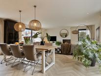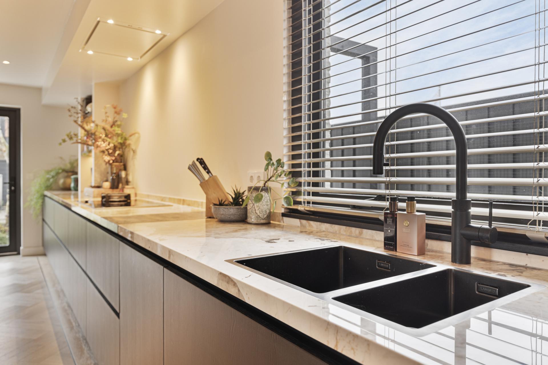 De keuken (Pelma) eveneens uit 2022 heeft een zee van opbergruimte in de onderkasten welke bijna allemaal uit uitschuifbare lades bestaan. Het schitterende Dekton* aanrechtblad is evenals de keuken 7.56m lang, wat een werkruimte! De hoge borreltafel in de keuken is eveneens van Dekton en in combinatie met de zwarte kast t.b.v. apparatuur is het een geweldig mooi geheel geworden. De inbouwapparatuur bestaat uit een koel/vries combi, magnetron, oven, een inductiekookplaat met wokbrander op gas, Quooker en een vaatwasmachine.